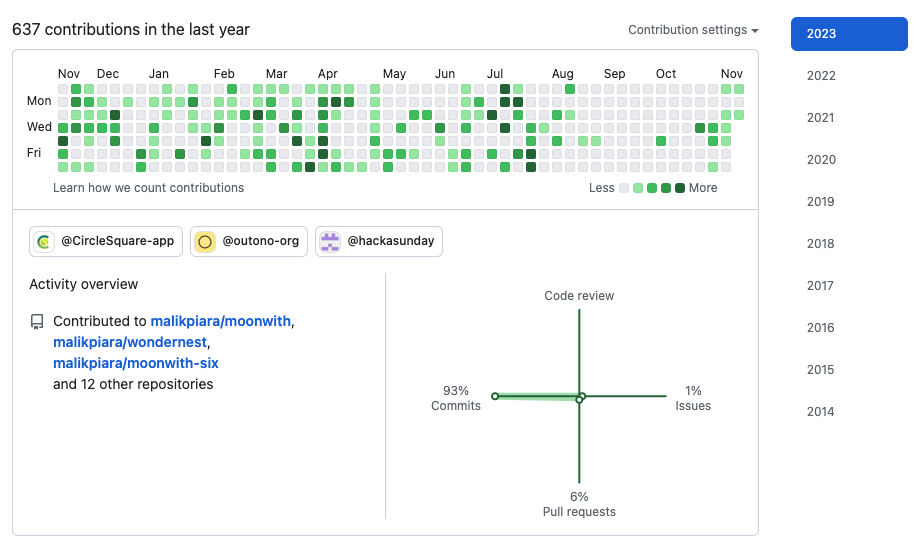 The user interface you see above is from Github and is ubiquitous with their brand. Many developers derive motivation and pride from seeing their contribution visualised over the array of green squares. And even though the system can be gamed, my hypothesis is that being able to visualise my writing activity might provide additional motivation and increase my consistency in the short-term. To test this, I'm hacking together an activity map over a couple of hours.
